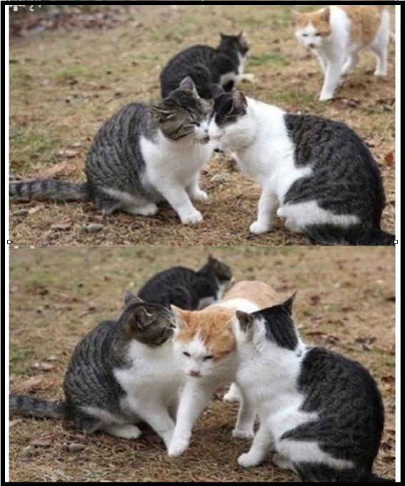 이때 다른 고양이 한 마리가 이들 사이를 가르며 지나간다.