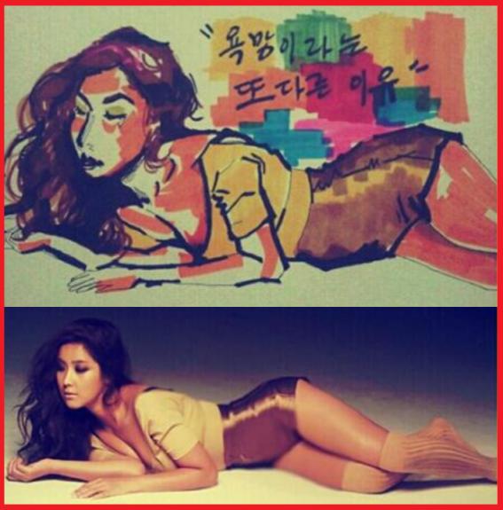 사진에서 솔비의 화보 사진과 함께 솔비의 사진 속 모습을 그린 그림이 담겨있다.