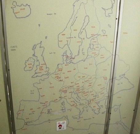또한, 수준 높은 화장실 낙서는 빨간 펜으로 도시가 일일이 표기돼 있었으며 나라 경계선을 음영으로 표현해 퀄리티를 높였다.