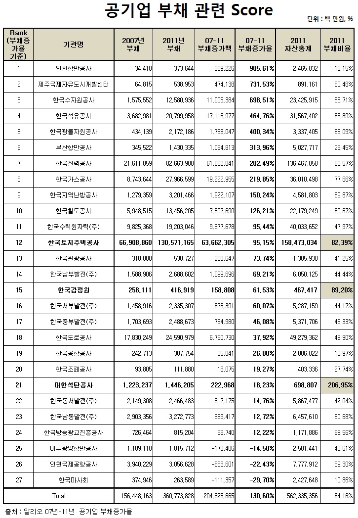 재벌 및 CEO 경영평가사이트인 CEO스코어(대표=박주근)가 지난해 말 현재 국내 27대 공기업의 자산과 총부채현황을 분석한 자료에 따르면 27대 공기업의 총부채규모는 360조7천738억여원으로 5년전인 지난 2007년의 156조4천481억여원에 비해 두 배가 훨씬 넘는 130.6%의 증가율을 나타냈다.