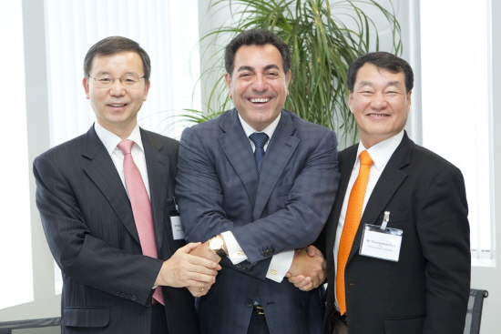 <지난 24일 런던 현지에서 열린 계약식 행사에서 삼성엔지니어링 강성영 전무, AMEC 사미르 브리코 CEO,