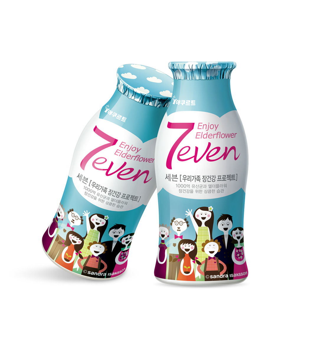 컬러풀하고 유쾌한 팝 일러스트 작품으로 잘 알려진 산드라 이삭슨은 7even의 용기디자인에 가족의 행복과 건강을 의미로 3대 가족 7명을 표현했다.