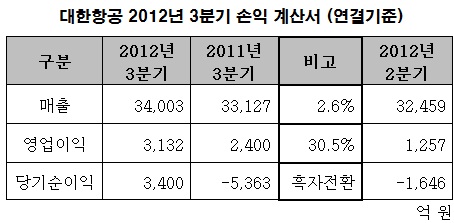 대한항공이 2012년 고유가와 글로벌 경기 침체 등 악재 속에서도 3천억원대의 분기 영업이익을 달성했다.