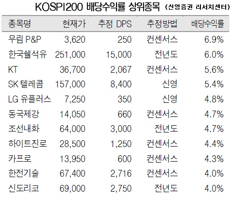 신영증권은 12월 결산법인 가운데 무림P&P, 한국쉘석유 등 11개사가 올해 4% 이상의 배당수익률을 기록할 것으로 예상했다. 이들 11개 회사의 최근 3개월 주가동향을 분석한 결과, 한전기술(-5.7%)을 제외한 10개 회사의 주가가 모두 상승해 배당주 강세 현상이 두드러졌다.