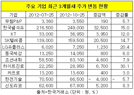 그 뒤를 이어 LG유플러스(20.4%), 한국쉘석유(15%), SK텔레콤(14.7%), KT(12%), 신도리코(8.3%), 조선내화(7.9%), 동국제강(6%), 무림P&P(5.7%), 카프로(3%) 순으로 주가 상승률이 높았다.
