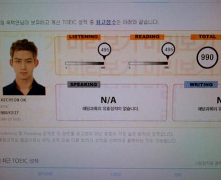 지난 24일 2PM 택연은 자신의 트위터에 "저번에 토익시험 봤는데 결과가 나왔네요. 10점 만점에 10이 아니라 990점 만점에 990점!"이라는 글과 함께 성적표를 게재했다.