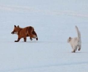 사진 속 고양이는 자신보다 몸집이 큰 여우를 쫓아 내고 있다.