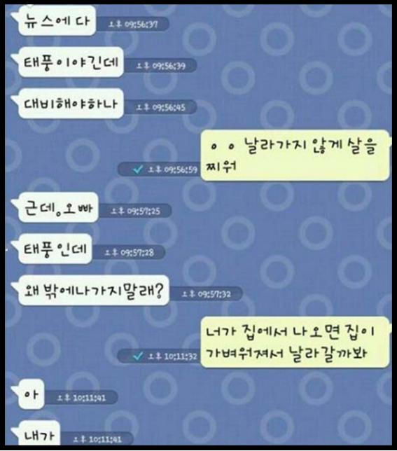 게시물에는 여자가 태풍대비를 해야하냐는 질문에 남자는 "날아가지 않게 살을 찌워"라고 한다.
