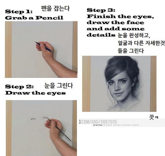 게시물에 따르면 '1. 펜을 잡는다, 2. 눈을 그린다, 3. 눈을 완성하고 얼굴과 다른 자세한 것들을 그린다'라고 적혀 호기심을 자아낸다.