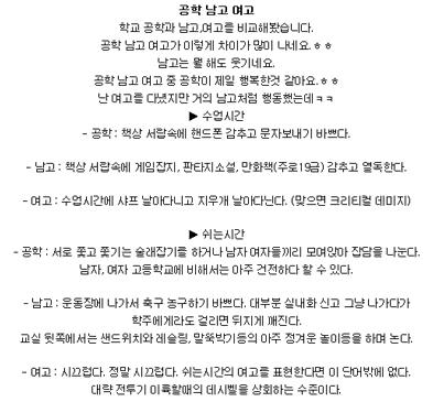 해당 게시물은 수업시간과 쉬는시간, 친구들끼리의 대화주제, 점심시간 등을 주제로 공학, 남고, 여고의 차이를 비교하면서 설명하고 있다.