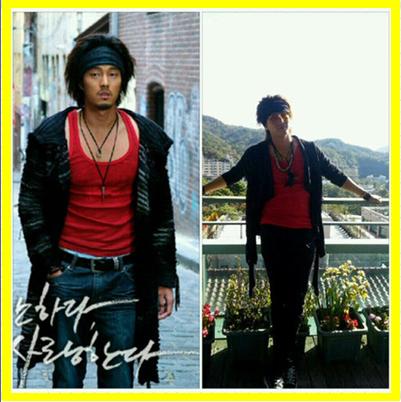 공개된 사진 속 택연은 지난 2004년 인기리에 방영됐던 KBS 2TV 드라마 '미안하다, 사랑한다'에서 소지섭이 선보였던 빨간색 민소매 티와 헤어밴드 패션을 연출해 폭소를 자아냈다.