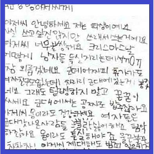 초등생이 느낀 군대 내용은 한 초등학생이 군인에게 쓴 위문 편지로 이 어린이는 "아저씨 너무 불쌍해요. 어떻게 크리스마스날 남자들 득실거리는 데서 외롭겠네요. 그런데 어차피 휴가가도 여자친구도 없는데"라며 군인을 더 비참하게 만든다. 이어 이 초등학생은 "여자들은 군대 갓 나온 사람들 정말 싫어해요. 험악하잖아요"라며 군인을 두 번 죽인다.