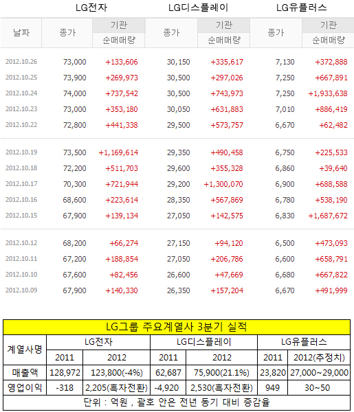 LG전자와 LG디스플레이는 실적개선에 힘입어, LG유플러스는 실적부진에도 불구하고 향후 전망에 대한 기대감이 높아져 주가가 상승하고 있다. 기관의 순매수가 결정적이었다.