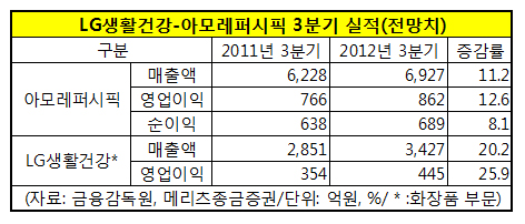 극심한 경기침체와 소비부진에도 불구 국내 화장품 업계의 라이벌인 아모레퍼시픽과 LG생활건강이 3분기에 나란히 두 자릿수 성장률을 기록하는 호실적을 낼 것으로 전망됐다.