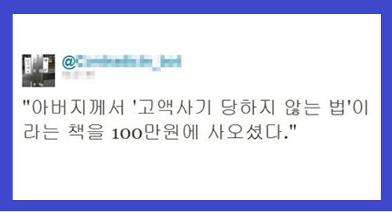 공개된 글에는 "아버지께서 '고액사기 당하지 않는 법'이라는 책을 100만원에 사오셨다"라고 적혀 있다.