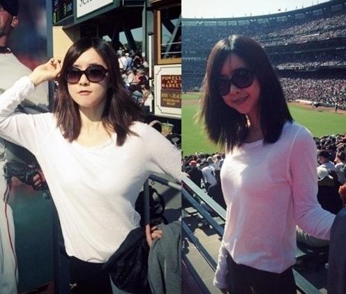 홍수아 美 야구장 사진에서는 홍수아가 야구 경기 관람 중 시구를 하는 포즈를 취해 팬들의 웃음을 자아냈다.