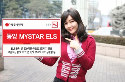 동양증권(www.MyAsset.com)은 다음달 2일까지 나흘간 KOSPI200, HSCEI, S&P500, 대우조선해양, 삼성전자, KT, LG화학, 삼성엔지니어링, LG이노텍을 기초자산으로 하는 고수익 조기 상환 가능 원금비보장형 ELS 6종 및 쿠폰지급형 ELS 2종 등 총 8종의 ELS 상품을 600억원 규모로 공모한다고 30일 밝혔다.