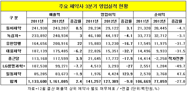 31일 금융감독원에 따르면 국내 10대 제약사 가운데 동아제약과 녹십자 등 3분기 실적을 공개한 7개사의 총 매출액은 1조1천611억원, 영업이익은 1천274억원으로 집계됐다.