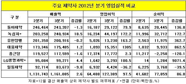 7개 제약사의 3분기 총 매출액(1조1천611억원)은 지난 2분기(1조1천317억원)보다 2.6% 증가했다.