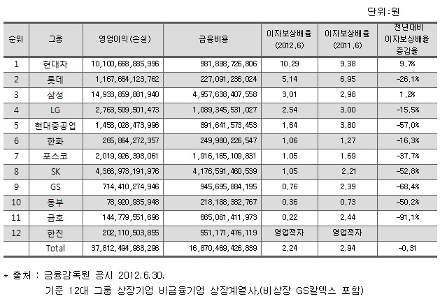12대 그룹중 이자보상배율이 높아진 곳은 현대차와 삼성그룹이 유일했고 나머지 10개사는 모두 줄었다.