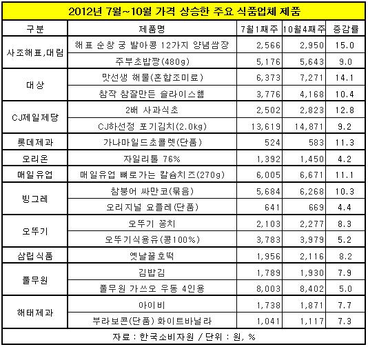가장 큰 폭으로 뛴 상품은 사조해표의 ‘해표 순창 궁 발아콩 12가지 양념쌈장’으로 7월 1째주 2천566원에서 10월 4째주 2천950원으로 무려 15%나 뛰었다. 사조대림의 초밥류인 ‘주부초밥짱’도 같은 기간 9% 가격이 올랐다.