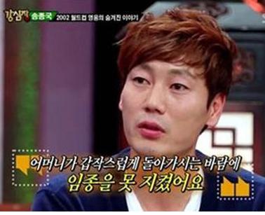송종국은 "올해 2월쯤 어머니가 갑자기 돌아가셨다. 그런데 나는 임종을 지키지 못했다"고 밝혔다.