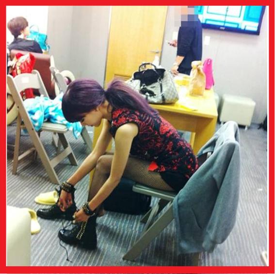 사진에서 은정은 대기실 의자에 앉아 신발 끈을 묶고 있는 모습이다.