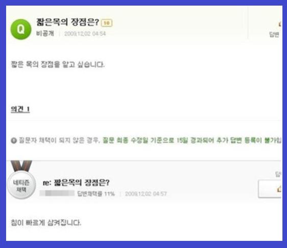 게시물 내용은 한 네티즌이“짧은 목의 장점을 알고 싶습니다”라는 질문을 하자 또 다른 네티즌의 답변에는“침이 빠르게 삼켜집니다”라는 재미있는 답이 적혀있어 웃음을 준다.