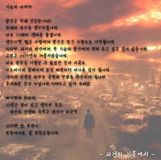하지만 사진 속 '지옥에서 온 편지'는 다소 섬뜩한 분위기를 연출하는 배경에 과거에서 예언 내용이 전해진다.