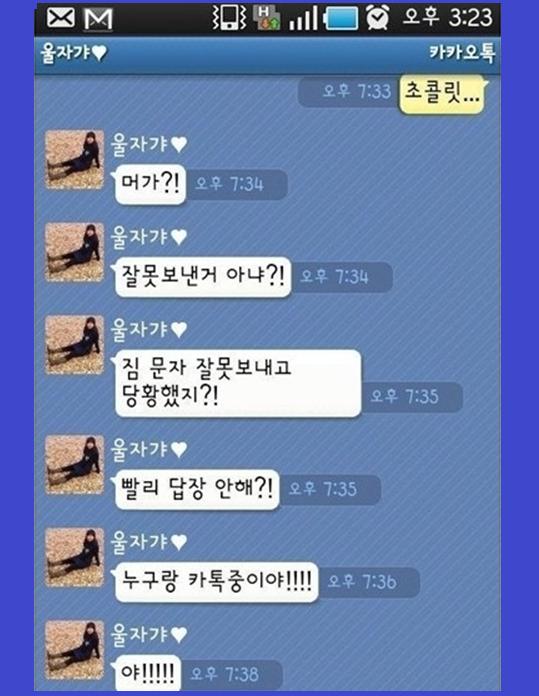 내용은 남자친구가 "초콜릿.."이라는 문자를 남기자 여자친구는 "뭐가?"라고 묻더니 이후 남자친구가 대답이 없자 추궁을 하기 시작한다.
