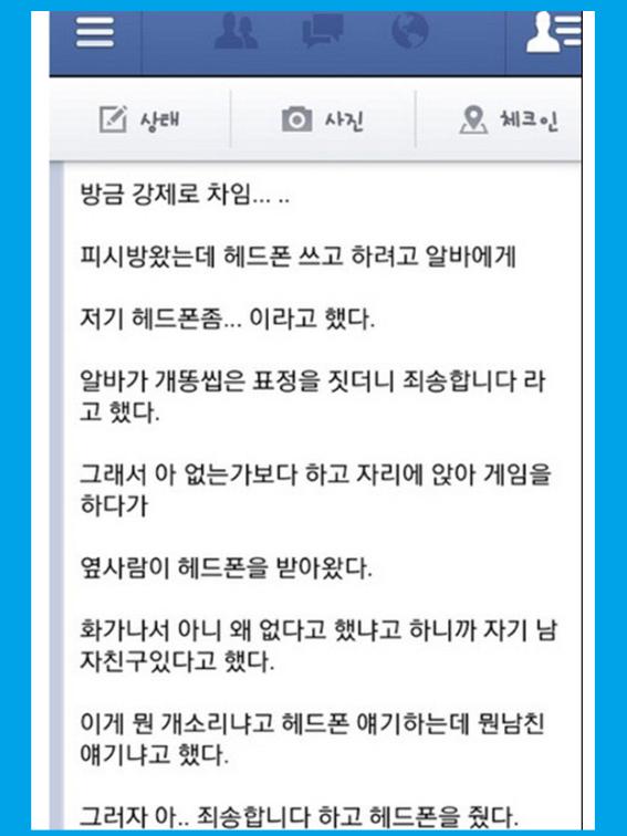 이후 옆 사람이 헤드폰을 받은 것을 보고 알바생에게 왜 없냐고 따졌더니 알바생은 자신이 남자 친구가 있다고 한다.