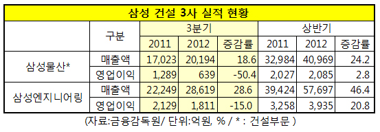 건설경기 불황 속에서도 지난 상반기 호실적을 냈던 삼성그룹 건설부문 중심축인 삼성물산과 삼성엔지니어링의 3분기 실적이 동반 하락했다.
