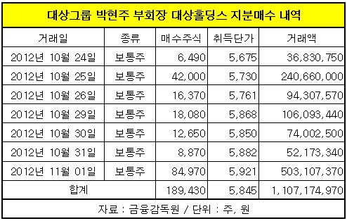 박 부회장은 지난달 24일부터 이달 1일까지 휴장일을 제외하고는 매일 일곱 차례에 걸쳐 대상홀딩스 주식을 장내매수했다.
