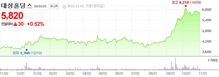 대상홀딩스 주가는 지난해 12월 19일 3천700원까지 떨어졌지만 최근 주력사 대상의 실적개선의 영향으로 지난 10월 9일 최고점인 6천210원까지 오른 바 있다.