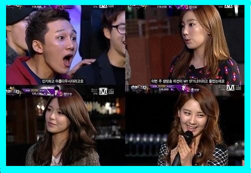 소녀시대의 멤버 태연, 수영, 서현은 2일 오후 방송된 ‘슈퍼스타K 4’에서 미션 발표를 위해 TOP6 유승우, 딕펑스, 정준영, 홍대광, 로이킴, 김정환과 만났다.