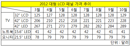 LED용 42인치 LCD 패널 가격도 10월 289달러로 9월 284달러보다 5달러 상승했다. 32인치 LCD 패널 가격도 9월 보다 1달러 오른 129달러를 기록했다.