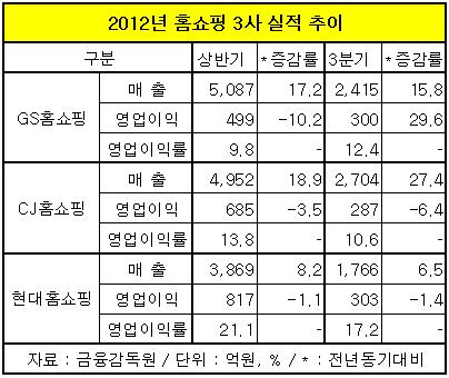 5일 금융감독원에 따르면 GS홈쇼핑은 올 3분기에 매출 2천415억원, 영업이익 300억원을 기록했다. 지난해 같은 기간에 비해 매출은 15.8%, 영업이익은 29.6%나 늘었다.