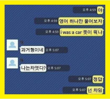 먼저 한 사람이 "영어 하나만 물어보자 'I was car'뜻이 뭐냐"라고 묻자 상대방은 "과거형이네. 나는 차였다?"라고 답한다. 그러자 질문했던 사람이 "정답. 넌 차임"이라고 말하며 이별을 통보했다.