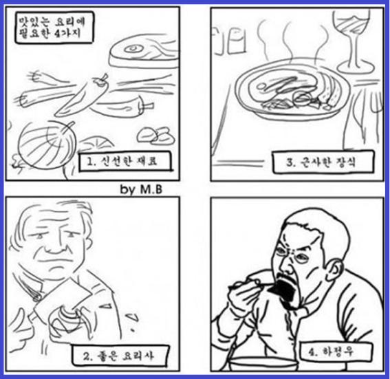 최근 온라인 커뮤니티 게시판에는 '맛있는 음식 4대요소'라는 제목의 그림이 올라왔다.