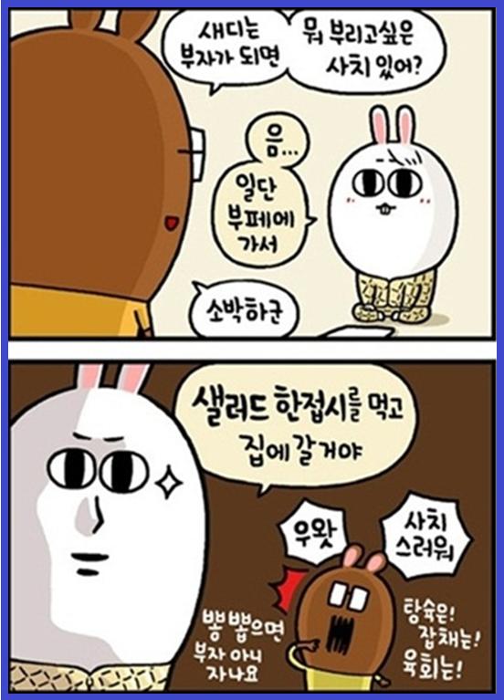 공개된 게시물에는 만화 속 주인공이 부자가 되면 부리고 싶은 사치에 대해 “부자가 되면 뷔페를 찾아 샐러드 한 접시만 먹고 나올 거야", “IPTV로 유료 영화를 결제해 재미없으면 5분 만에 끌 거야”라고 말한다.