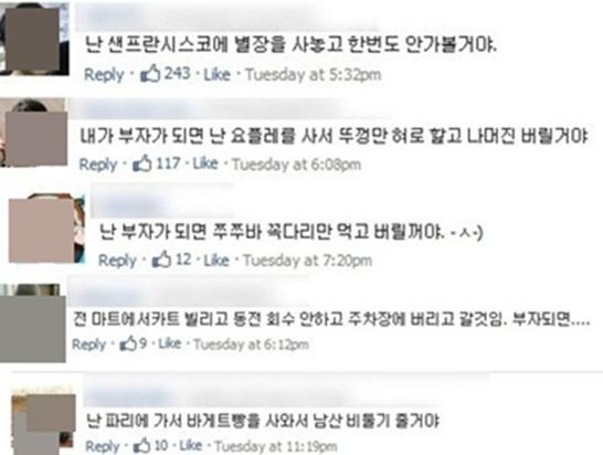 이에 네티즌들은 “난 샌프란시스코에 별장을 사놓고 한 번도 안가볼거야", "난 부자가 되면 쭈쭈바 꼭다리만 먹고 버릴꺼야", “전 마트에서 카트 빌리고 동전 회수 안하고 주차장에 버리고 갈 것임"이라는 소박한 바람을 나열해 소소한 재미를 선사했다.