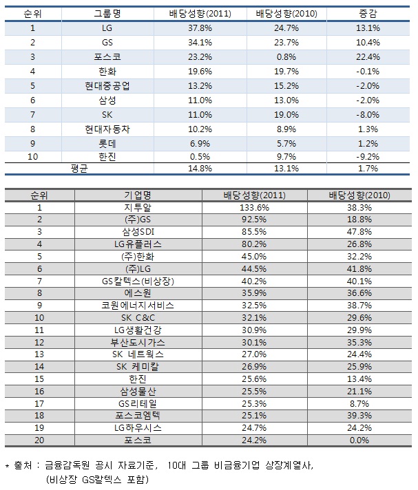 그룹별로는 LG와 GS그룹 계열사들의 배당성향이 높은 반면 한진 롯데그룹 계열사들이 배당에 인색했다.