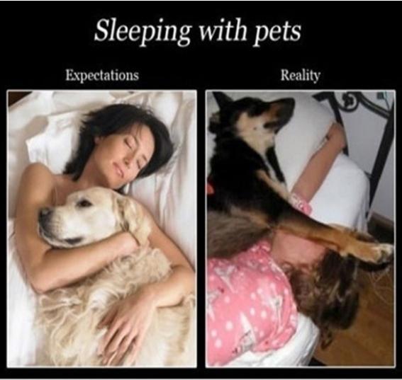 개와 잘 때 내 모습 사진은 상상 속의 개와 잘 때 모습과 현실의 모습이 비교돼 있어 폭소를 자아낸다.