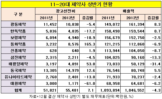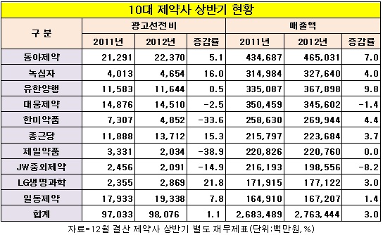실제로 20대 제약사 가운데 광고선전비 증가율이 가장 높은 곳은 매출 14위인 동화약품이고, 17위인 태평양제약이 그 뒤를 이었다.