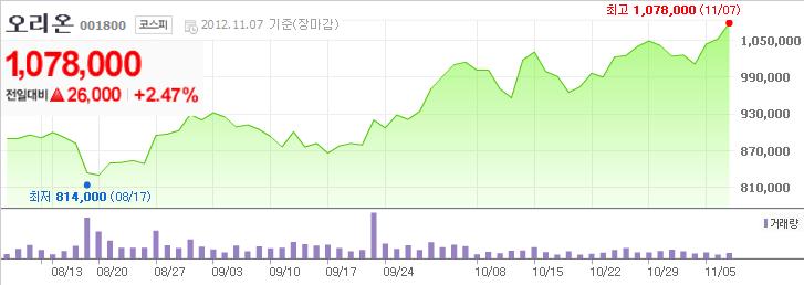 한국거래소에 따르면 오리온 주가는 7일 하루동안 2만6천원(2.4%)이나 오르며 107만8천원으로 마감돼 최고가를 경신했다.