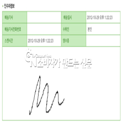 오후 5시경 배송업체인 경동택배 홈페이지를 통해 조회를 한 양 씨는 놀라지 않을 수 없었다. '오후 1시경 배송완료' 상태로 기재된 것은 물론 수령인 사인까지 떡하니 있었던 것.