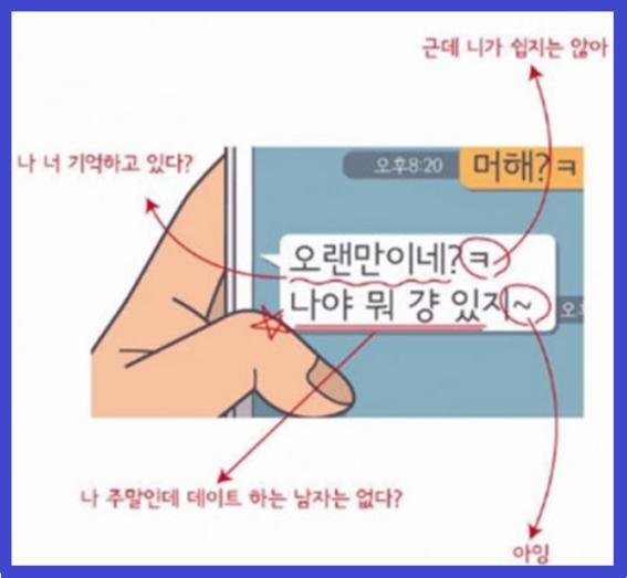남자는 "오랜만이네"는 "나 너 기억하고 있다", "ㅋ"은 "근데 네가 쉽지는 않아", "나야 뭐 걍(그냥) 있지"는 "나 주말인데 데이트하는 남자 없다", "~"은 "아잉"으로 풀이했다.