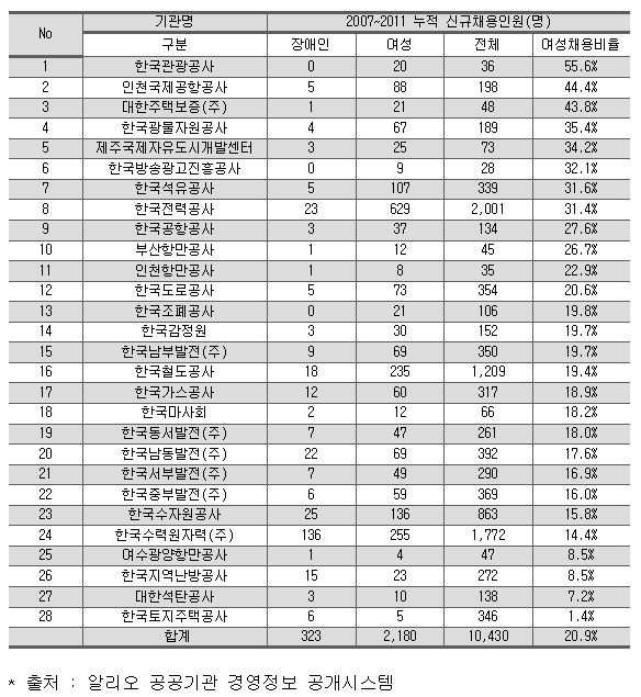 재벌 및 CEO 기업경영분석사이트인 CEO스코어(대표 박주근)가 공기업 정보분석기관인 알리미의 자료를 토대로 조사한 결과에 따르면 지난 2007년 이후 지난해까지 5년 동안 28대 공기업들은 2천180명의 여성을 신규채용하는데 그쳐 전체채용인원에서의 비율이 20.9%에 머물렀다.