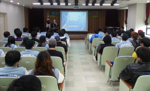 김충규 동해지방해양경찰청장이 9일 강원도립대학 세미나실에서 해양경찰과 재학생 110여명을 대상으로 특강을 실시했다.