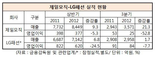 국내 패션업계의 양대산맥인 제일모직과 LG패션이 불황을 이기지 못하고 올 3분기에 나란히 수익이 하락한 성적표를 내놓았다.